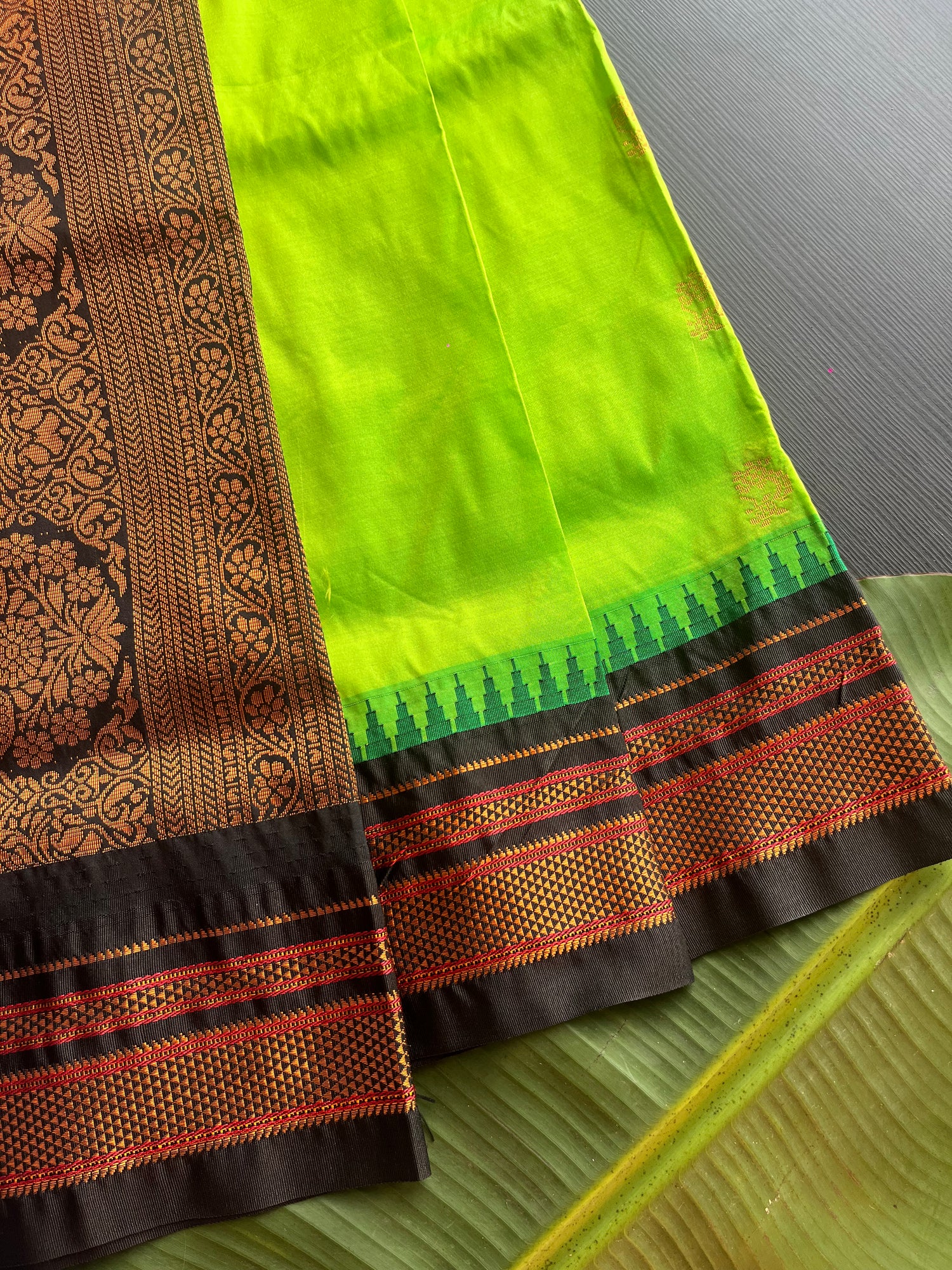 Our fresh parrot green Temple Irkal Paithani is a literal bridal dream. It is a perfect choice to go for your wedding day if you want to feel and look rooted in tradition! Grab yours now!