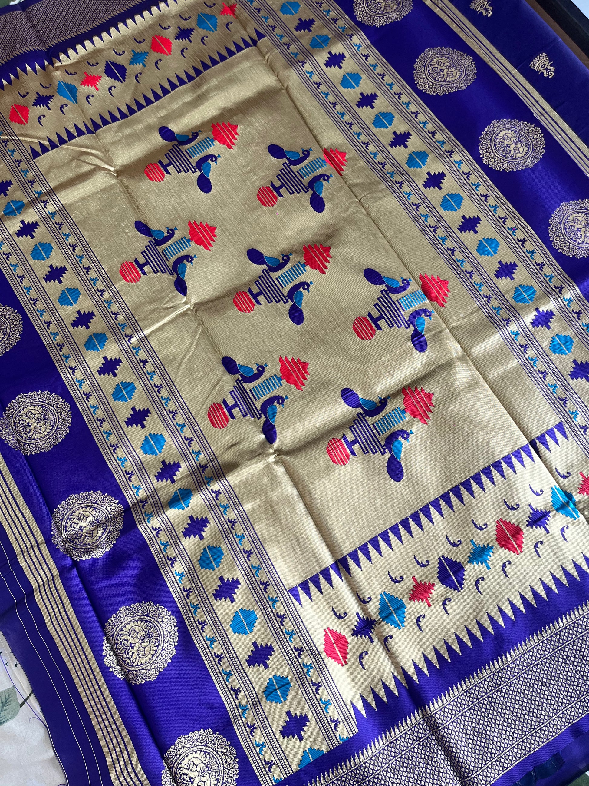 This elegant Paithani dazzles with intricate all-over jhumka butti, adding a lively charm to your look. The traditional paithani pallu completes the design.